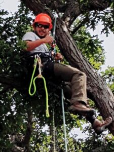 Planting a new mix fruit orchard & renovating an old cherry on this day. You can clearly see the Arborwear logo on the leg of