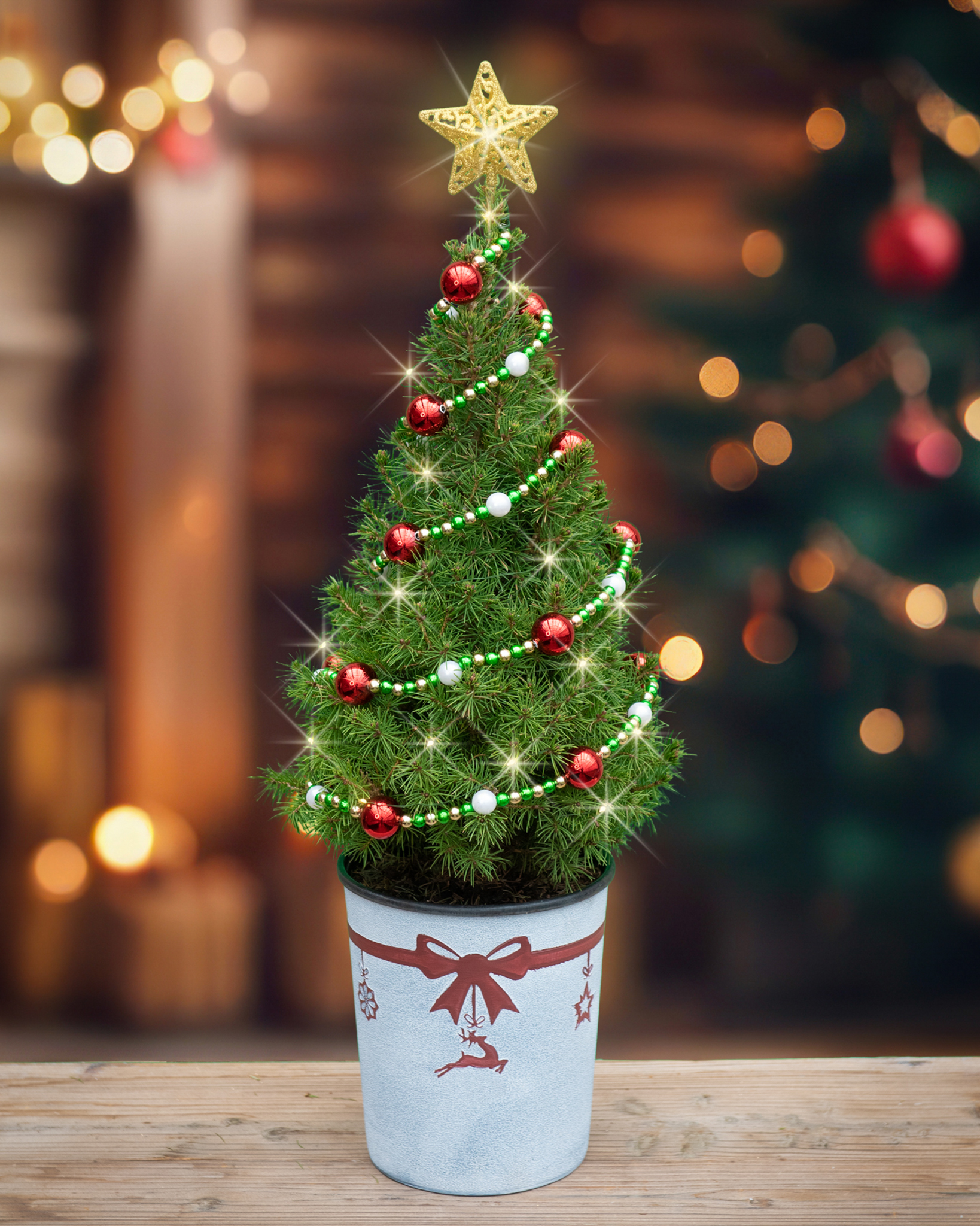 This Table Top Tree arrives with all the trimmings pictured for fun, easy holiday decorating. This live Table Top Tree is a perfect way to decorate in children’s rooms, home entryways, office settings, elderly facilities, and more! These are nursery-grown dwarf Alberta spruce trees and may be planted outdoors after the holidays to enjoy for years to come!