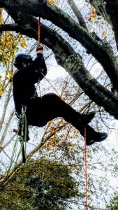 Footlocking up to reach the canopy on this Big maple Tree to start the crown Cleaning and Trimming work In my favorite Black canopy pants…The