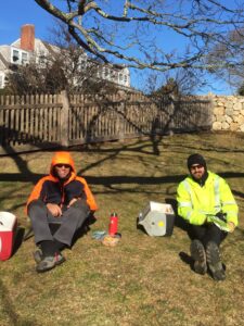 Two long time Landcare Stewards caught chilling at lunch fully decked out in Arborwear.!