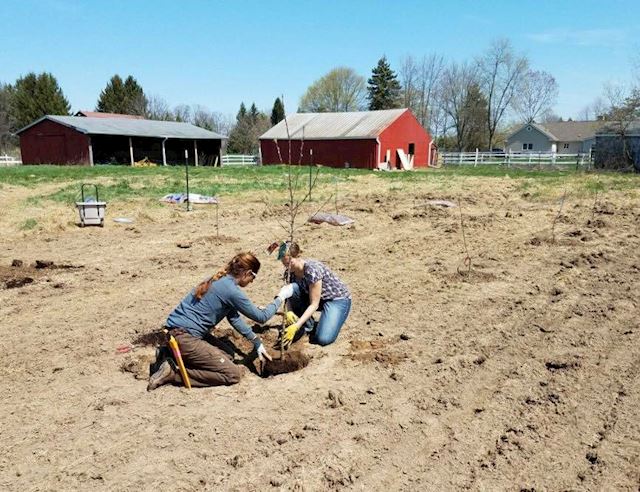 Planting a new mix fruit orchard & renovating an old cherry on this day. You can clearly see the Arborwear logo on the leg of my climbers pants. Silky handsaw clipped to the belt loop, wearing my gloves and safety glasses, working with homeowner.