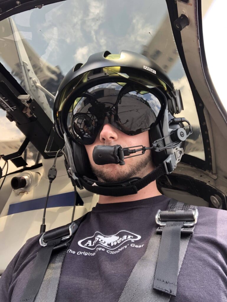 Wearing an arbor wear shirt in a MD500 helicopter after doing some pipeline inspections in West Virginia. Photo taken after the flight while shutting down the aircraft.