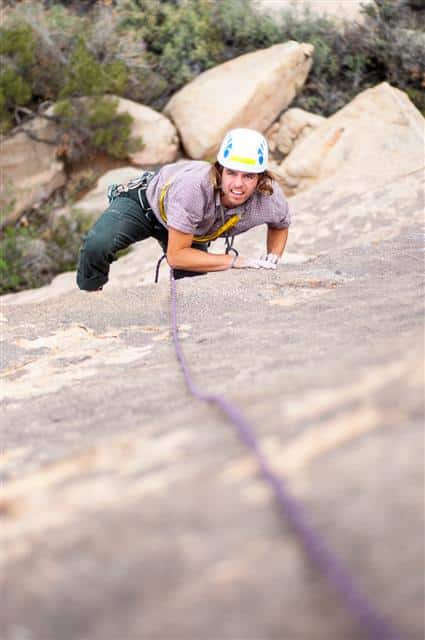 It was a cloudy day in Joshua Tree National Park, and here I am following the leader up a friction slab route on Reggie Dome. My fingers are shredded, but not the pants.